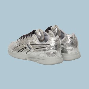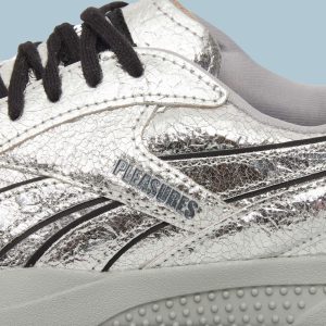Rooted in Reebok’s ’90s indoor soccer archives and reimagined in collaboration with PLEASURES. these shoes channel the grunge and punk aesthetic the LA-based streetwear label is known for. They feature a silver crinkled leather upper with black leather accents. finished with custom branding on the window. tongue. and footbed.