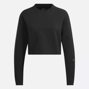 Go to and from the studio in sporty style. This women’s Reebok sweatshirt is made with a super-soft cotton blend that’s perfect worn as a layer to and from the gym. but sleek and polished enough for your favorite brunch spot. The slightly cropped length and overlap detail in the back give it a modern look.