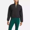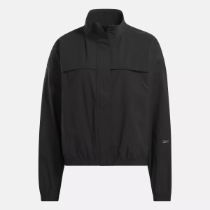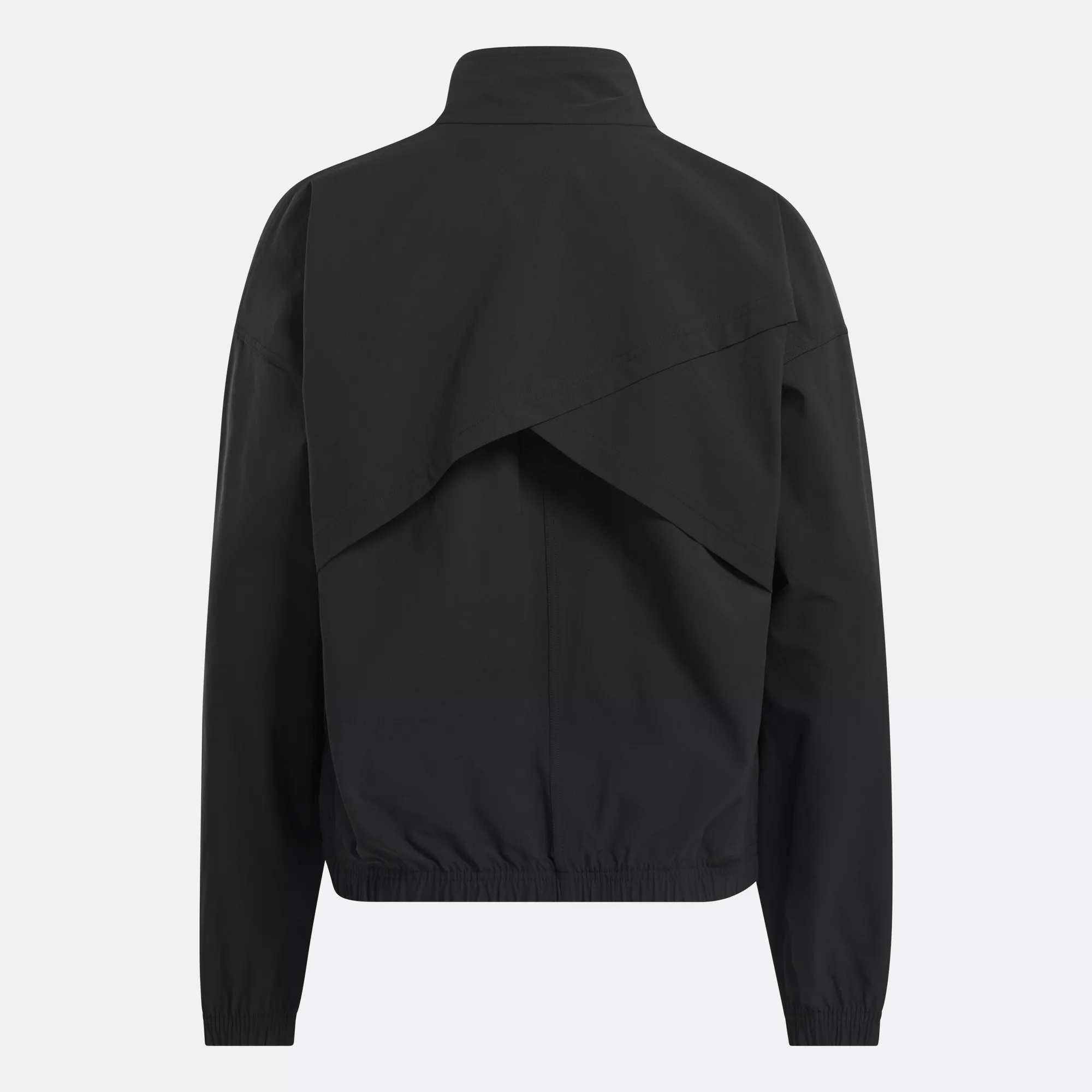Layer this women’s Reebok jacket over your workout clothes and head to the gym in sleek. modern style. Made from SkyStretch woven fabric. the jacket has a relaxed fit and clean lines. A mesh back panel keeps the air flowing for comfort when the day heats up.