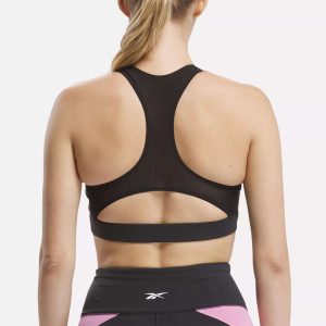 This versatile Reebok medium support sports bra lets you conquer all levels of training. anytime. Built in our soft performance Nylux fabric with a second-skin feel. Spacer lining gives you a lifted and locked-in fit. and its angled seams and wide hem deliver stability as you move. When it’s time to up the intensity. RBK-DRY technology helps wick sweat away from your skin.