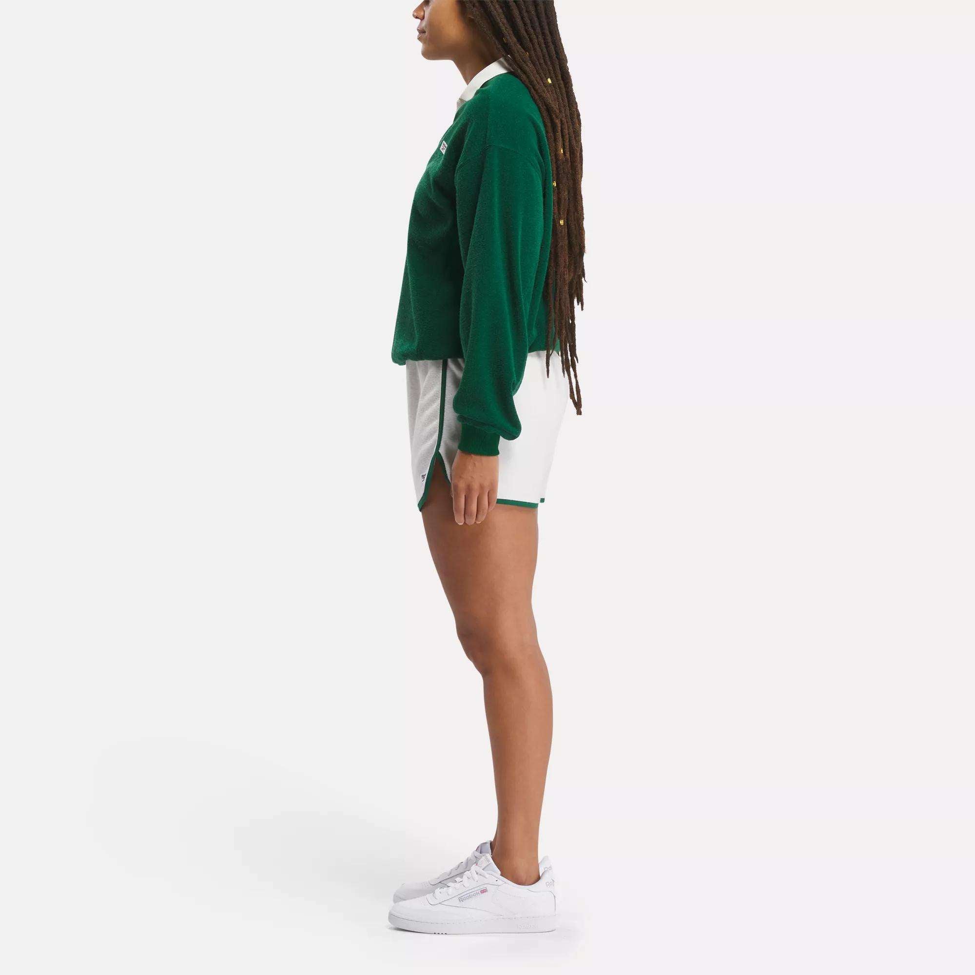 A modern twist on classic tennis style. these women’s Reebok shorts put a fresh spin on a casual look. They’re made from an ultra-soft towel terry fabric that stays comfortable through and through. Vintage-inspired embroidery on one leg complements the contrast binding. Pair them with your favorite tee to hang at home or even meet up with friends for a low-key tennis match.