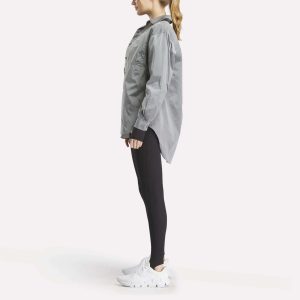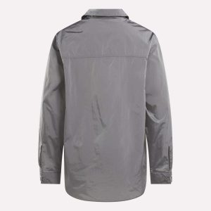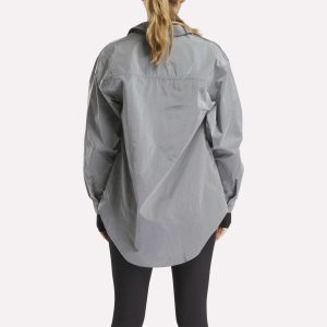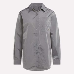 A classic gets a sporty makeover. This women’s Reebok shirt is made of crinkle nylon fabric with a slight sheen. The relaxed fit. button-front closure and fold-down collar make it as easy to love as it is to wear.