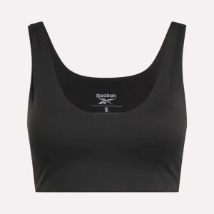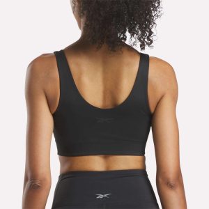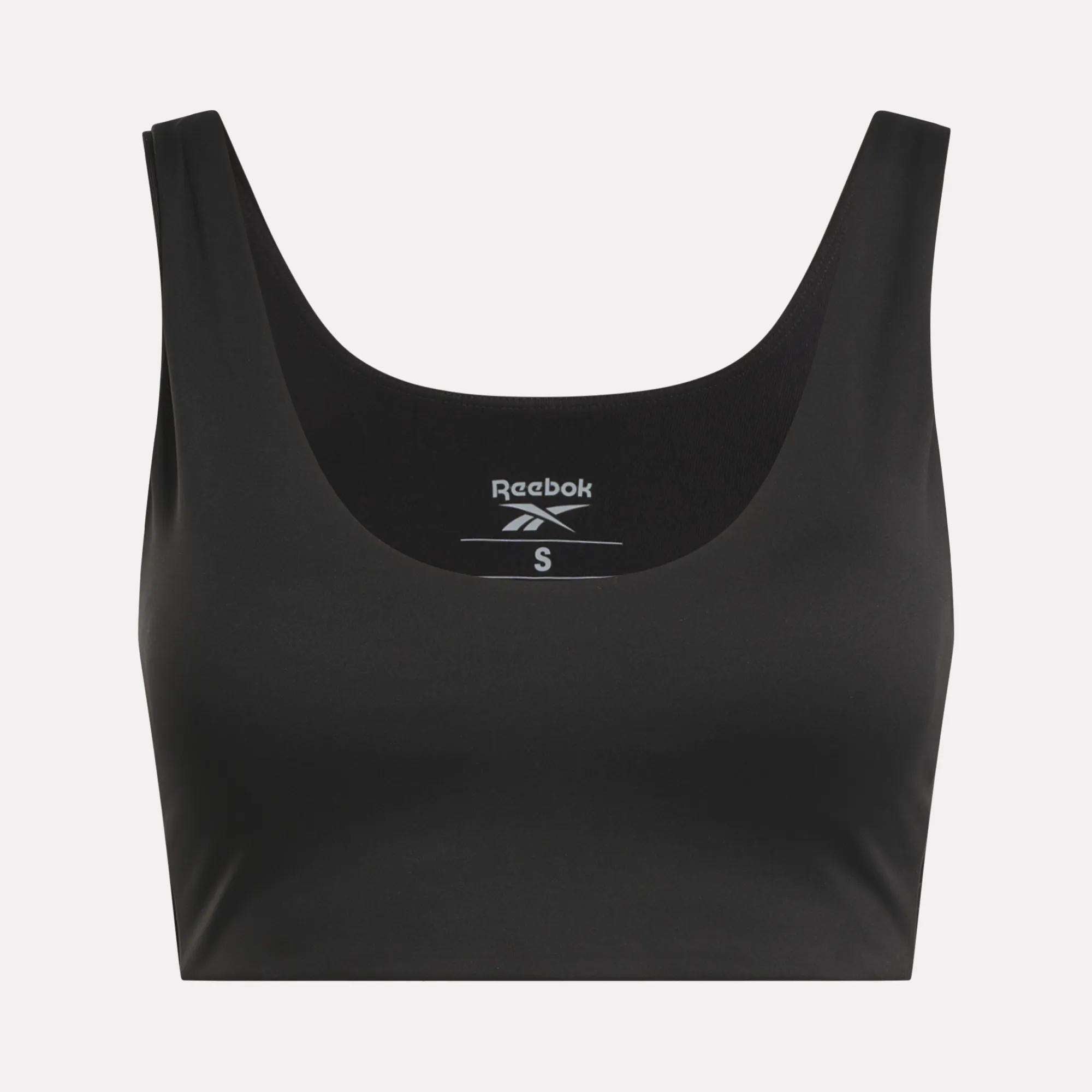 Take on the barre. bike or yoga mat. This women’s Reebok bra offers medium-impact support to help you go all in on your studio workouts. Stretchy. sweat-friendly fabric is cut with a flattering V-neck.